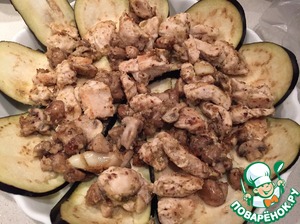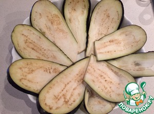 Тем временем форму смазываем сливочным маслом. Тонко режем баклажан и выкладываем на дно.