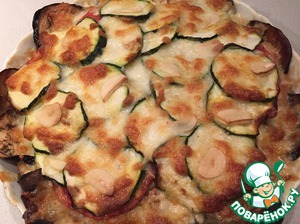Следом цуккини. Заливаем смесью яиц и сливок ( соль и перец по вкусу). В духовку мин на 35. У меня при температуре примерно 180 гр. Достаём. Посыпаем твёрдым сыром или моцарелла ( если есть). Сверху выкладываем тонкие дольки чеснока и до зарумянивание убираем опять в духовку.