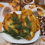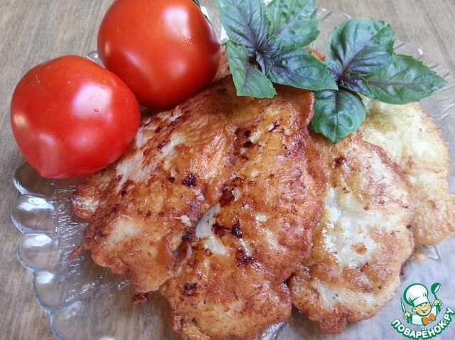 Обмакиваем мясо в кляр и обжариваем на растительном масле под крышкой. И выкладываем на блюдо, украшаем по желанию.