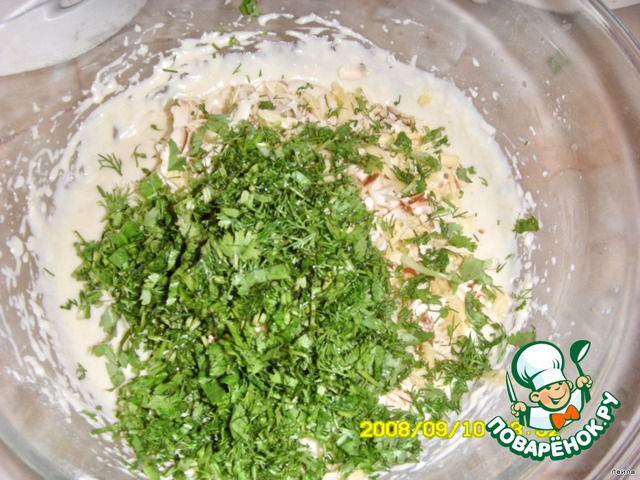 В конце мелко нашинковать зелень и через терку сыры. Хорошо перемешать.