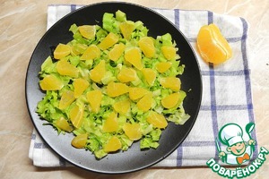 Почистить апельсин (или мандарины, как у меня), удалить белые прожилки и порезать каждую дольку на несколько частей.