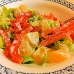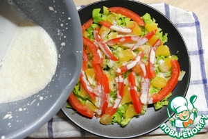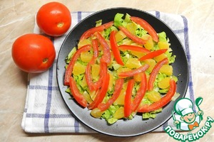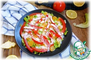 Помидор порезать соломкой, удалив заранее семечки и сок. Выложить поверх цитрусовых.