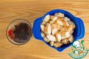 Изюм промыть и дать постоять в кипятке, для мягкости. Затем воду сливаем.