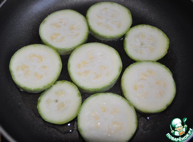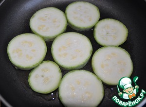 Цуккини режем тонкими кольцами, обжариваем на оливковом масле с обеих сторон до румяной корочки.