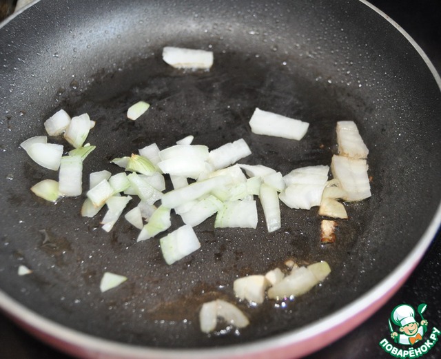 На той же сковороде обжариваем мелко нарезанный репчатый лук, по необходимости доливаем масло.