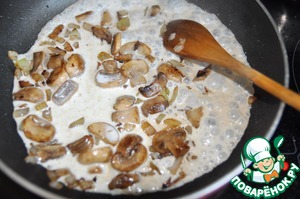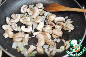 Берём формочки для запекания. Можно взять даже чайные чашки. Смазываем внутри сливочным маслом. Кладём на дно жаренные в соусе шампиньоны.