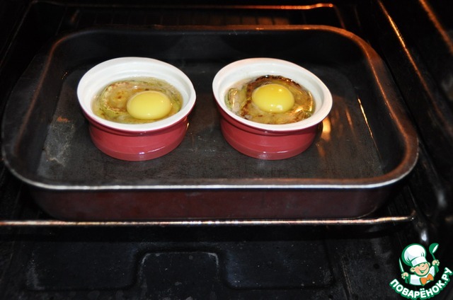 В форму наливаем горячую воду, чтобы слой воды доходил примерно до середины формочек, и ставим в нагретую до 220 градусов духовку на 5-10 минут. Нам нужно, чтобы белок схватился, а желток при этом остался жидким.