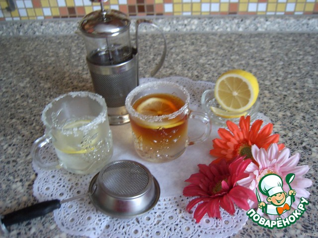 Разливаем подсахаренный кипяток по чашкам, кладем в каждую по дольке лимона и через ситечко (чтобы не попали чаинки) осторожно наливаем сверху крепкую заварку.