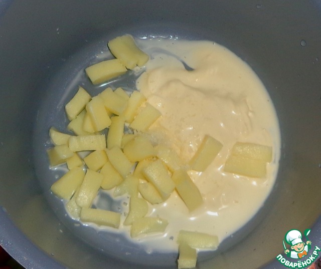 Добавить молоко и размешать. Поставить кастрюлю на огонь, чтобы сыр расплавился. Получился сырный соус, которым будем заливать основные ингредиенты.