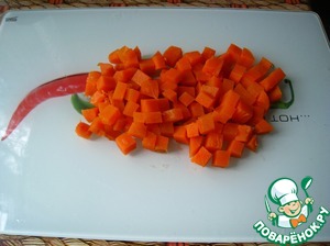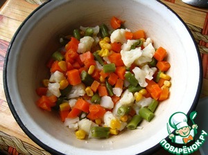 Можно взять готовую смесь «Маседуан», а можно приготовить самим. Для этого морковь, капусту и фасоль нужно отварить и нарезать кубиком. -