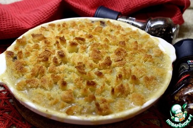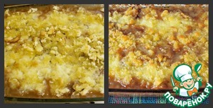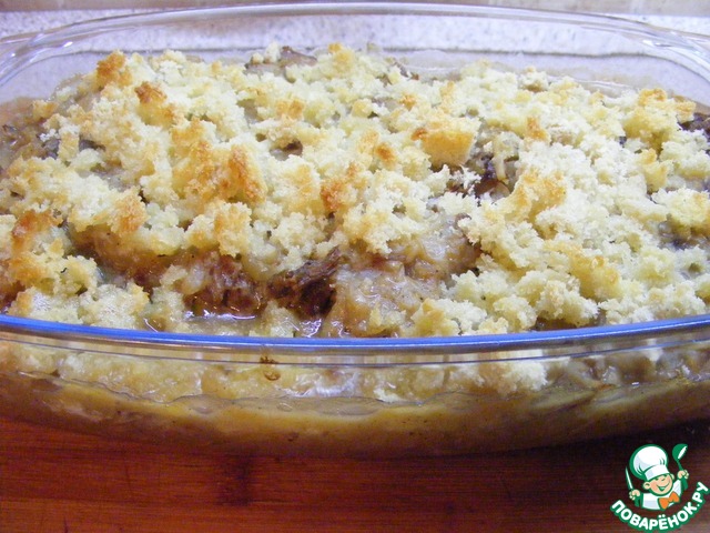 Булку или белый хлеб раскрошить и засыпать полностью верх соуса. Масло растопить и нагреть, полить поверх крошек. Здесь тоже есть одно уточнение. По мне масла слишком много, хватило бы и 100 гр.