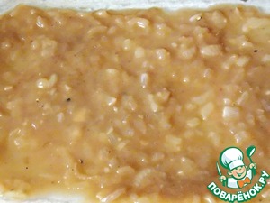 Делаем соус. Для этого мелко шинкуем лук и обжариваем на сковороде с растительным маслом на маленьком огне помешивая 15 мин. Всыпаем муку, перемешиваем и жарим еще 2 мин. Влить уксус (если нет такого, то замените его красным сухим вином), перемешать, добавить бульон и проварить еще 15 мин. помешивая, чтобы не пригорел. Здесь есть один момент. Мука у всех разная, а это значит что и густота будет разная. Так вот Соус должен быть по консистенции как кисель средней густоты. Если это не так то добавьте бульон до нужного состояния, иначе соус пригорит. Пробуя соус мне не хватило сладости и я добавила коричневый сахар. Подгоните его под свой вкус. Снимаем с огня и часть соуса распределить на дне формы.