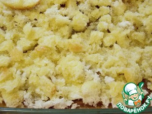 • Булку или белый хлеб раскрошить и засыпать полностью верх соуса. Масло растопить и нагреть, полить поверх крошек. Здесь тоже есть одно уточнение. По мне масла слишком много, хватило бы и 100 гр.