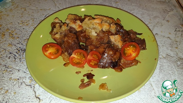 Вареную говядину нарезать на кусочки и обжарить немного в масле. Уложить первый слой мяса и залить верх еще частью соуса. Положить на него остатки мяса и залить все оставшимся соусом.