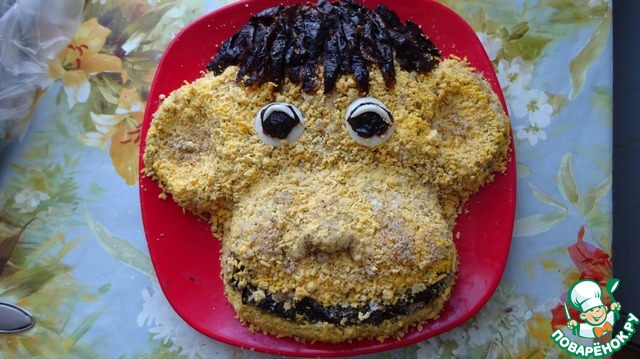 В очередной раз, хочется поделится идеей оформления Новогоднего салата. Салат делала по образу мартышки из мультфильма "38 попугаев" Ингредиенты этого салата многим знакомы. Но мне хотелось поделиться с Вами оформлением. Обратите внимание на чернослив, он бывает очень сладкий, в этом случае, я бы рекомендовала в салат добавить 2-3 соленых огурчика.