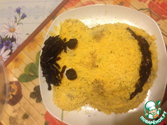 Цитирую ( В очередной раз, хочется поделится идеей оформления Новогоднего салата. Салат делала по образу мартышки из мультфильма "38 попугаев" Ингредиенты этого салата многим знакомы. Но мне хотелось поделиться с Вами оформлением. Обратите внимание на чернослив, он бывает очень сладкий, в этом случае, я бы рекомендовала в салат добавить 2-3 соленых огурчика.)