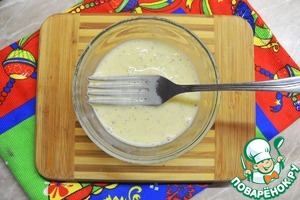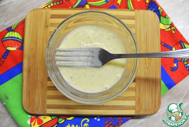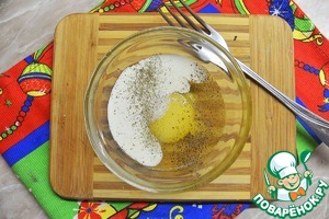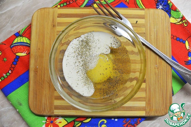 Смешать яйцо с 1 ч. л. сливок, с 1 ч. л. холодной воды, щепоткой прованских трав, черным перцем и солью.