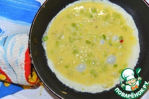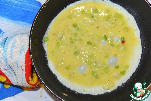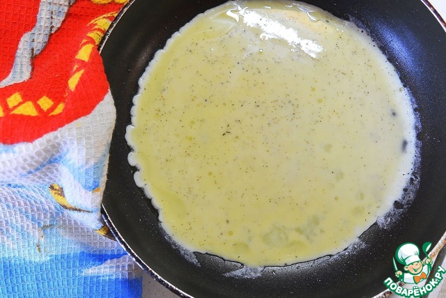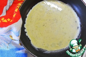 Вылить жидкость на сковороду, смазанную слегка оливковым маслом. У меня диаметр сковороды 15 см. Если у вас диаметр больше, то нужно увеличить количество яиц, иначе блинчики будут слишком тонкими!