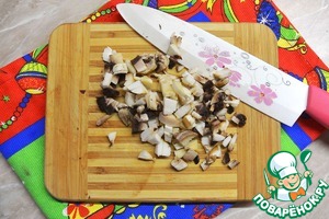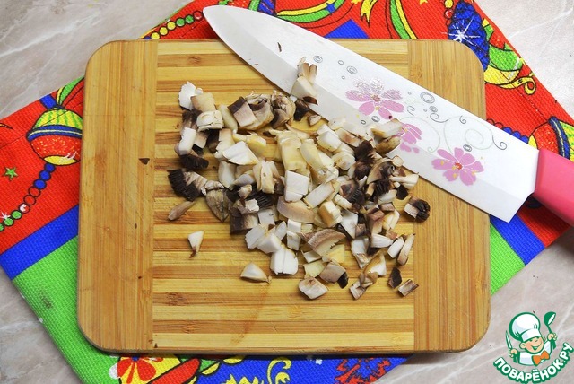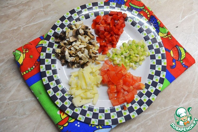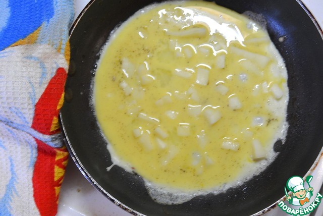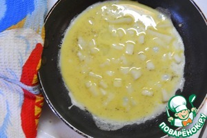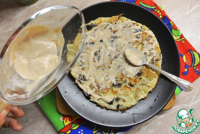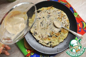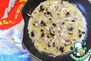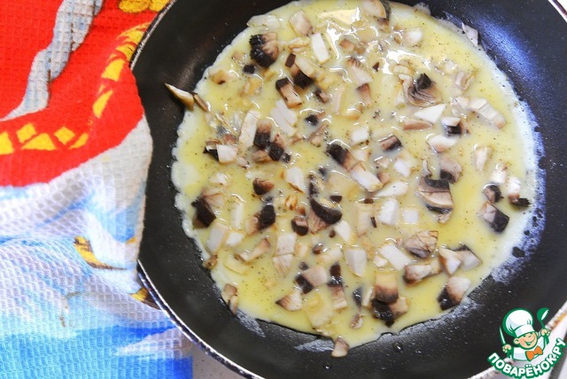 Сверху выложить первую начинку - грибы. Прикрутить огонь и прикрыть крышкой сковороду. Испечь омлет.