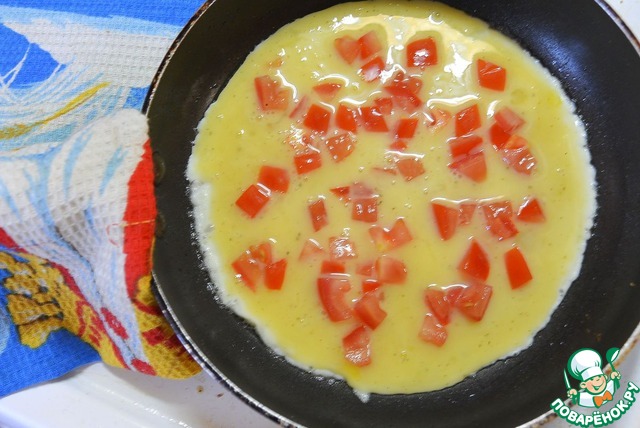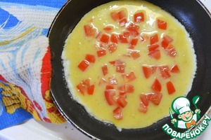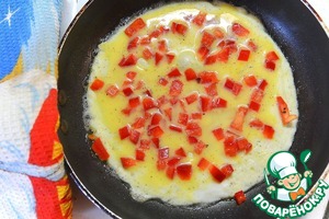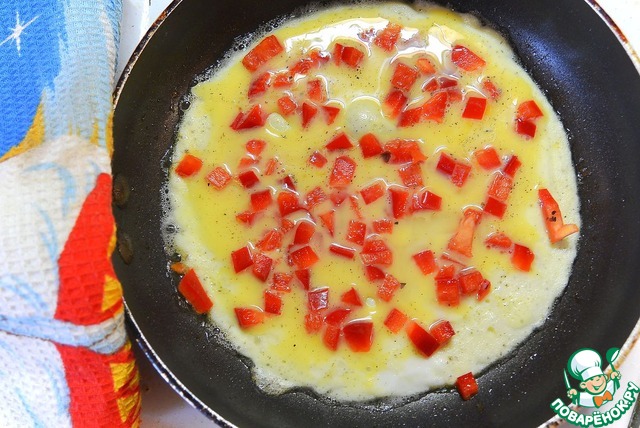 С 4 оставшимися яйцами, прованскими травами, перцем, солью, 4 ч. л. сливок и 4 ч. л. воды повторить те же манипуляции, а именно взбить и испечь омлетные блинчики. На второй выложить начинку из болгарского перца,