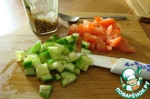 Пока делается омлет, режем половинку помидора мелко. Я семена удалила. Так же режем огурец.