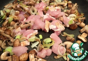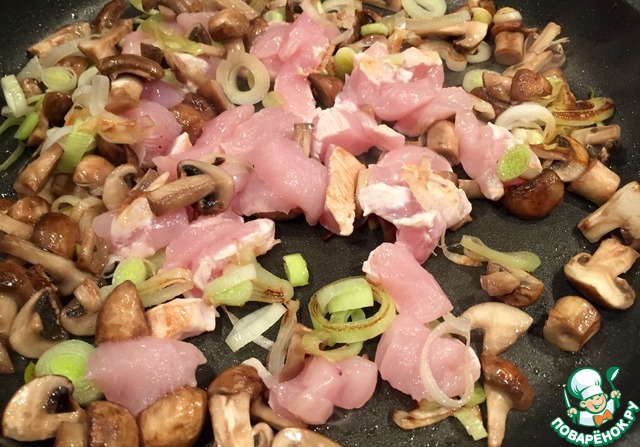 Для начала, нарежьте порей и грибы. Обжарьте. Добавьте куриную грудку. Обжарьте. Добавьте болгарский перец и имбирь.