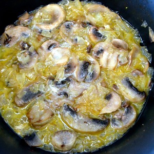 Тем временем, грибы нарезать тонкими ломтиками, лук нашинковать. Выложить готовые грудки на тарелку. Кипятить оставшийся сок еще 10 минут, пока он не выкипит наполовину. Добавить сливочное масло, лук и грибы и тушить около 8 минут до мягкости. Снять с огня и поставить остывать.