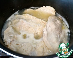 Положить куриные грудки (4 грудки примерно по 200 г каждая) в кастрюлю, полить их лимонным соком и бульоном (или белым вином), приправить солью и перцем. Поставить на огонь, довести до кипения, убавить огонь и тушить 20 минут под крышкой, переворачивая грудки, до готовности.