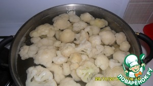 В кипящей, подсоленой воде поочередно отвариварем цветную капусту (5 мин.), фасоль (3-5 мин), грибы ( 10 мин.). Все овощи замороженные! Степень готовности овощей пробуйте, кто как любит : помягче или хрустящие. Откидываем на дуршлаг, даем стечь воде. Бульон оставляем для соуса.