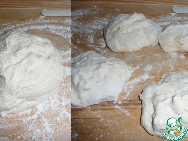 Двухэтапный процесс выброжения теста закончен. Тесто не расплывается, к рукам практически не липнет. Тесто выложить на хорошо припыленную мукой доску, присыпать весы мукой, взвесить и разделить на 4 равные части.