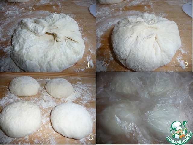 Тесто скважистое, работать нужно аккуратно, не выдавливая газ. Слегка разравнять заготовку и собрать ее в шар. Каждый кусочек теста округлите. Для этого нужно собирать края теста к центру. Шов тщательно залепить, а затем подкатать на сухом столе (без муки) до гладкого состояния. Накрыть пленкой (предварительно припанировав ее мукой) на 5-10мин.