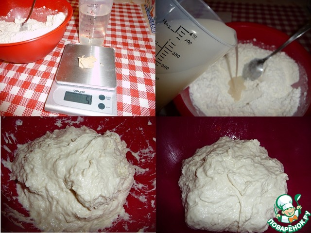 Дрожжи растворить в воде. Муку смешать с солью. Влить дрожжевой коктель в муку. Замес деликатный, ручной. Если тесто плывет, следует добавить немного муки. В готовых изделиях мы должны получить крупные поры.