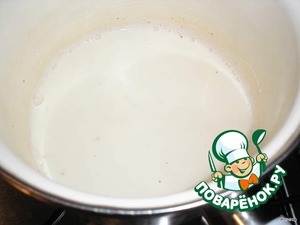 В ковшичек наливаем сливки и воду и доводим до кипения. Половинку сливок добавляем в начинку.