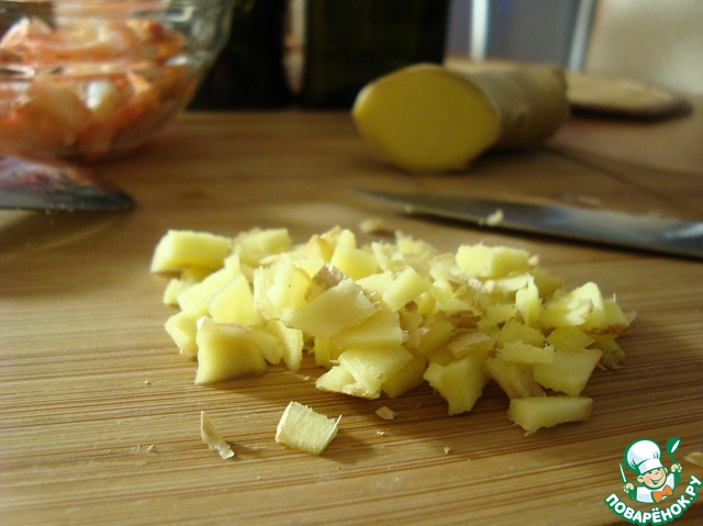 • Откинула на дуршлаг, обдала холодной водой и быстро их почистила. Имбирь помыла, обсушила, отрезала 2 см и мелко его нарезала.