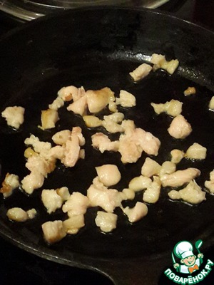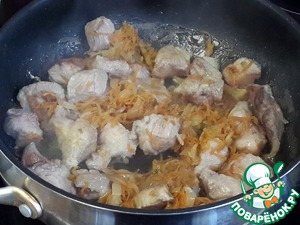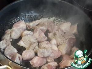 Сюда же добавьте нарезанную кубиками свинину и хорошо её обжарьте со всех сторон