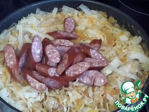 Квашеную капусту отожмите от рассола. Если капуста слишком кислая - промойте её теплой водой и отожмите. Добавьте квашеную капусту к мясу, сюда же добавьте брусничное варенье, перемешайте и слегка обжарьте всё вместе.