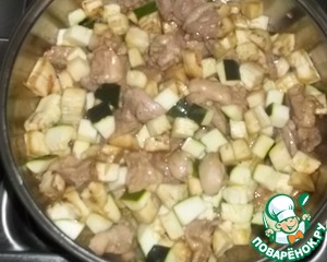 В сотейнике разогреть раст. масло, добавить кусочки курицы вместе с соевым соусом и луком. Потушить 5 минут под крышкой. Добавить цуккини (кабачок) и баклажан.