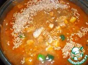 Посолить, поперчить по вкусу, добавить 1 ст. л. соевого соуса. Пока оставить в стороне.