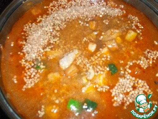 Добавить гречневую крупу и залить горячей водой, перемешать. Гречка разная, я на 1 стакан гречки взяла 2,5 стакана воды (горячей). Добавить соль по вкусу, прованские травки или сушеный укроп, обязательно щепотку молотой гвоздики и 1 ч. л. порошка имбиря. Накрыть крышкой. Готовить на медленном огне. Моя гречка была готова через 30 минут. При необходимости добавить немного воды в процессе приготовления. Дать постоять 15 минут и подавать.