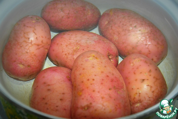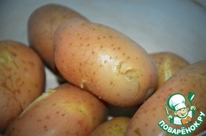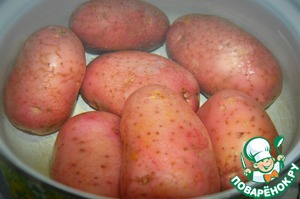 Каждую картофелину разрезаем пополам, солим и перчим, выкладываем в форму, смазанную маслом.