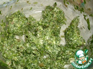 На спинке очищенной и выпотрошенной целой рыбы делаем два косых продольных надреза с каждой стороны и кладем в них смесь масла и зелени