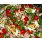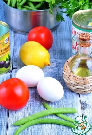 Нарезать фасоль, помидоры, яйца, маслины на две части, добавить тунца, рубленую зелень, нарезанную луковицу, давленый чеснок и филе анчоусов, посолить и поперчить по вкусу. Смешать оливковое масло с лимонным соком, заправить салат, перемешать.
