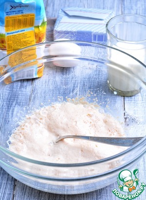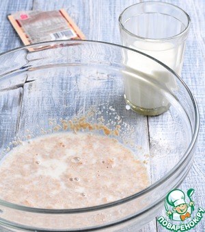 Залить дрожжи небольшим количеством теплого молока, добавить столовую ложку сахара, накрыть чистым полотенцем, оставить на 10-15 минут набухать.