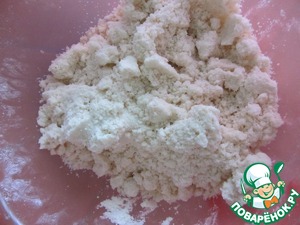 Берем другую миску и делаем тесто. Роль теста выполняет здесь песочная крошка. И это замечательно не надо ничего месить))) Насыпаем муку, сахар 180г, соль, разрыхлитель. Берем холодный жир, терку ставим в муку, макая постоянно жир в муку, натираем его на терке. Чтоб не залипал одним куском на терке. А затем просто руками перетираем в крошку.