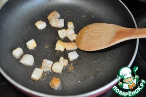 Бекон режем кубиками и обжариваем на сковороде до вытапливания жира. |