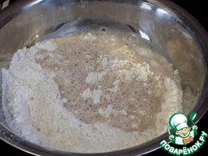 Просеять и смешать оба вида муки, добавить дрожжи, кардамон, ром и соль, влить чуть теплую воду