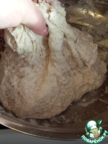 Замесить тесто. Затем по технологии вымешивания необходимо тесто насытить кислородом. Для этого в течение 7-8 минут нужно вытягивать тесто и складывать, затем опять вытягивать и складывать. Муку желательно не подсыпать, после вымешивания тесто станет эластичным.