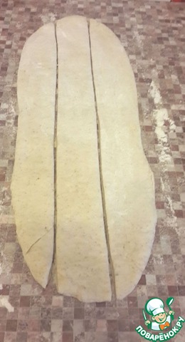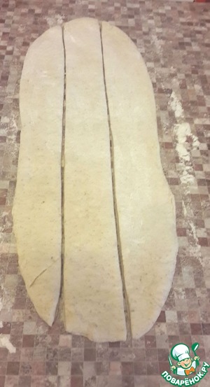 После подъема тесто обмять на посыпанном мукой столе, раскатать в пласт, разрезать на полоски