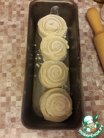 Каждую полоску свернуть в "улитку". Выложить булочки на противень или в форму и оставить для расстойки на некоторое время (15-20 минут)