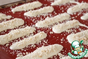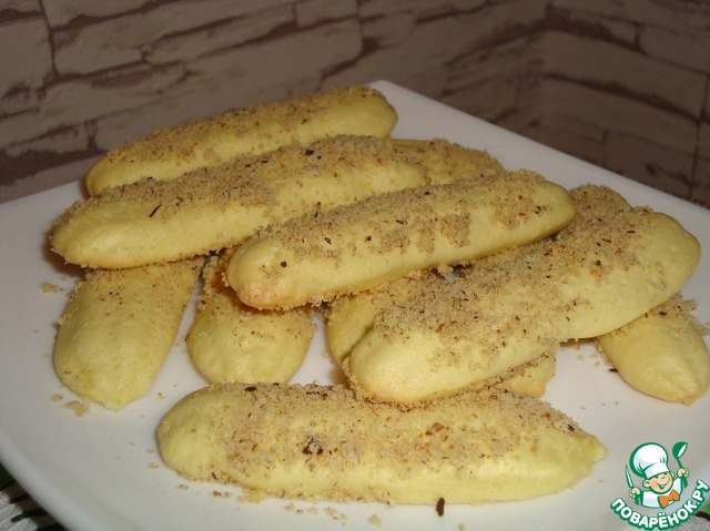 Выложить тесто на застеленный силиконовым ковриком или пергаментом противень при помощи кондитерского мешка или ложки полосками толщиной около 1.5 см и длиной 8-10 см. (Ложкой мне совсем не понравилось выкладывать, печенье получается очень широкое и трудно сделать длинные полоски.) Посыпать измельченным миндалем.